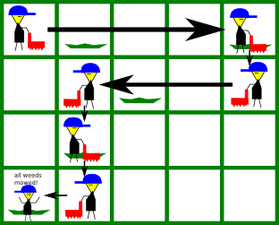 You have a land-mower with you to mow all the weeds. Initially, you are standing with your lawnmower at the top-left corner of the garden. That is, at cell (1,1). At any moment of time you are facing a certain direction − either left or right. And initially, you face right.