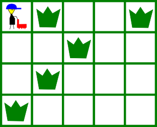 You are not allowed to leave the garden. Weeds will be mowed if you and your lawnmower are standing at the cell containing the weeds (your direction doesn't matter). This action isn't counted as a move.